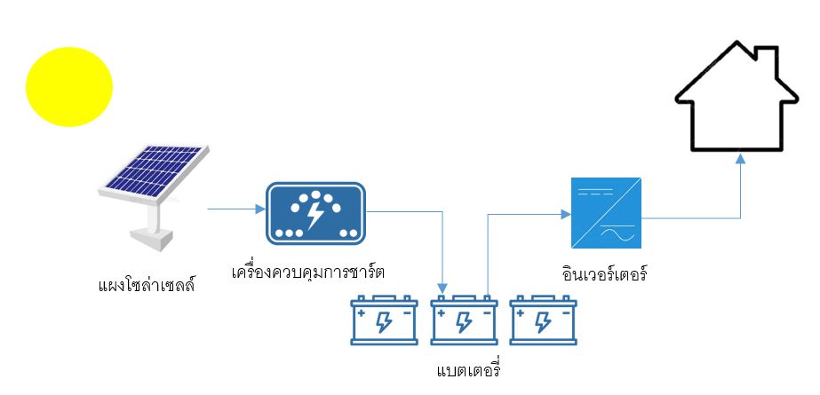 Off Grid คือ การผลิตไฟฟ้าจากพลังงานแสงอาทิตย์ด้วยแผงโซล่าร์เซล โดยตรง โดยไม่มี ไฟฟ้าจากหลวง มาทำงานร่วมด้วย เหมาะสำหรับ พื้นที่ห่างไกล ที่ ไฟหลวงยังเข้าไม่ถึง ข้อดีคือ ไม่ต้องพึ่งไฟจากหลวง ข้อจำกัด คือ ไม่สามารถทำงานได้ เมื่อเวลา แสงสว่างหมด บางที่ นิยมนำมาต่อพ่วงกับ แบตตารี่ เพื่อเก็บไว้ใช้ ตอนไม่มีแสง เราเรียกว่า แบบ Off Grid +Hybrid นั่นเอง