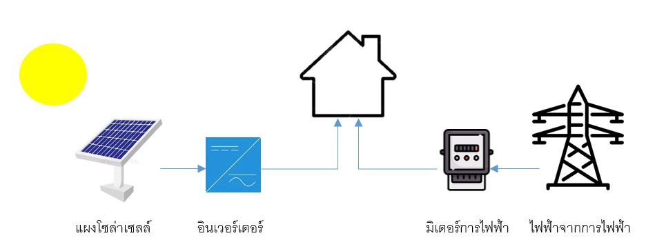 On Grid คือการนำไฟฟ้าที่ผลิตจากแสงอาทิตย์ มาใช้ คู่กับ ไฟฟ้าจากหลวง เมื่อเวลามีแสงสว่าง เราสามารถใช้ไฟฟ้า ที่ผลิตจากแสงอาทิตย์ได้โดยไม่มีต้นทุนค่าไฟฟ้าเลย เพราะเราไม่ต้องใช้ไฟจากหลวงในช่วงดังกล่าว หากเมื่อใด แสงสว่างน้อยลง จน แผงไม่สามาถผลิตไฟได้ ไฟฟ้าจากหลวง ก้ จะถูกนำเข้ามาใช้แทนที่ โดยอัตโนมัติ ปัจจุบัน กฎหมาย และ การไฟฟ้า อนุญาต ให้ใช้ รูปแบบ การใช้ไฟฟ้า แบบ on grid นี้ เป็นรูปแบบหลักในการ ใช้ไฟฟ้า ร่วมกัน 2 ระบบ โดยต้อง ได้รับใบอนุญาต ในการต่อขนานไฟ อย่างเป็น ทางการ จากการไฟฟ้า ในพื้นที่เขตใช้งานนั้นๆ ทั้ง แบบที่อยู่อาศัยและโรงงาน